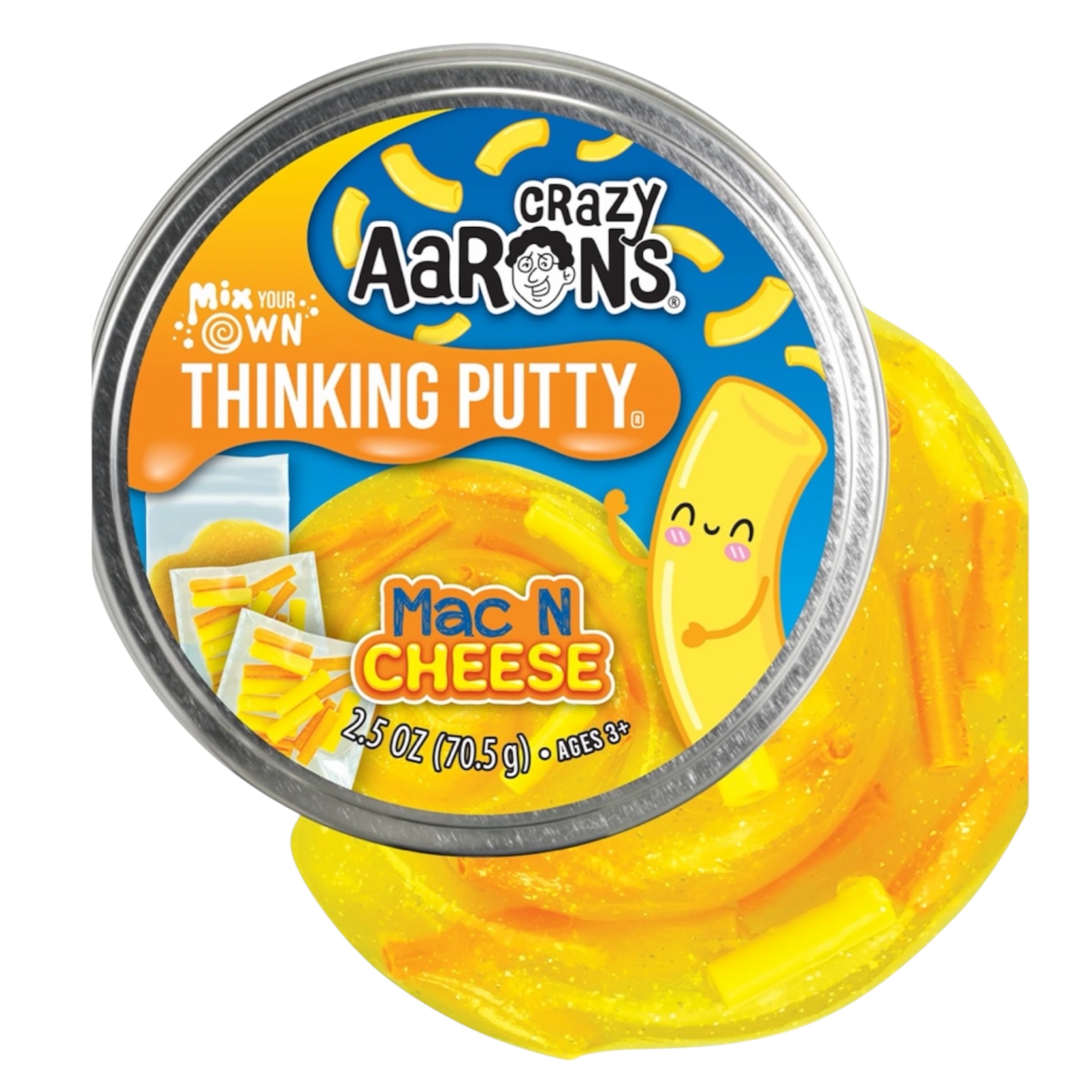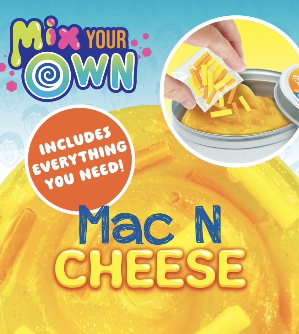 Mix your own Mac N Cheese Thinking Putty®! Everything you need is included in the tin. Simply mix the color-izer with the clear putty, add your mix-in, then play!